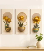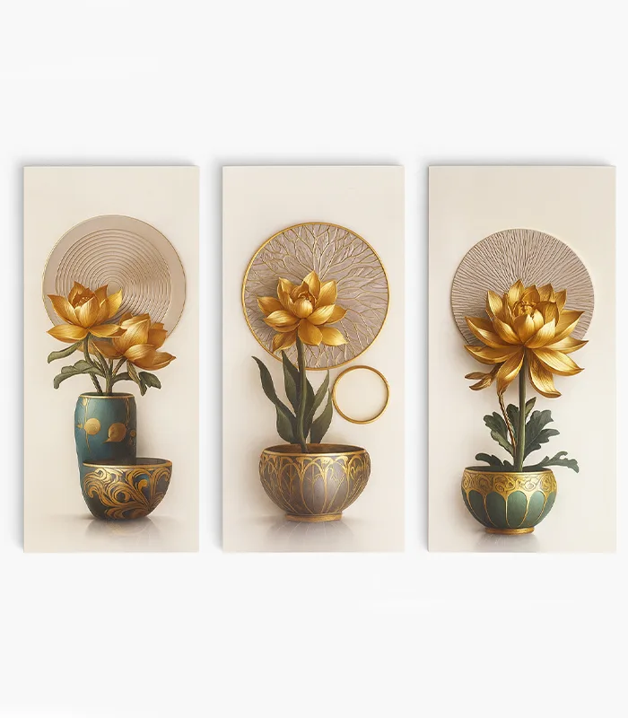 كل قطعة من هذا الطقم تجسد فناً راقياً يعبر عن الجمال الطبيعي بأسلوب حديث. الأزهار الذهبية تضيف بريقاً ناعماً يلفت الأنظار دون مبالغة، في حين تمنح الخلفية الهادئة إحساساً بالراحة والتناسق البصري. هذه التفاصيل تجعل الطقم من أجمل اشكال تابلوهات بالصور التي يمكن استخدامها لتزيين الريسبشن أو غرفة المعيشة، حيث تتناغم الألوان الهادئة مع مختلف أنواع الأثاث سواء كانت بدرجات داكنة أو فاتحة.