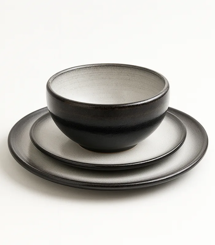 بولة خزفية مصنوعة يدويًا - مع طبقين مصنوعين يدويًا على شكل دائري