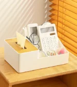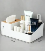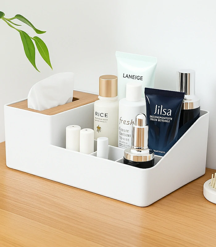 صُنع منظم ميكب صغير من خامات متينة وسهلة التنظيف، ليكون مناسبًا للاستخدام اليومي على طاولة الزينة أو التسريحة. كما يتضمن التصميم جزءًا مخصصًا لحفظ المناديل، وهو مثالي لمناديل إزالة المكياج أو مناديل الوجه، لتجميع كل احتياجاتك في مكان واحد.