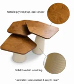 أضف لمسة منعشة من الطبيعة والأناقة إلى منزلك مع طقم ترابيزات مودرن خشب المكوّن من 3 قطع، والمصمم بشكل مميز مستوحى من شكل الورقة. هذا الطقم يجمع بين العملية والطابع الفني، ليكون إضافة أنيقة لأي ديكور عصري. تم تصنيع كل ترابيزة مودرن بسطح من الخشب الطبيعي مغطى بقشرة أوك عالية الجودة، ما يمنحك مظهرًا دافئًا مع متانة تدوم طويلًا.