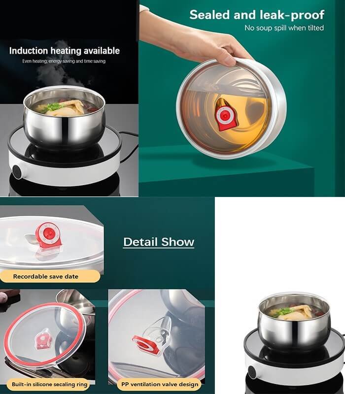 واحدة من أبرز ميزات هذا الطقم هي إمكانية استخدامه على البوتاجاز الحثّي (Induction cooker) لتسخين الطعام أو إعادة تسخينه مباشرة داخل الوعاء دون الحاجة لنقله إلى قدر آخر، مما يوفر الوقت والجهد ويقلل من اتّساخ أدوات إضافية.
