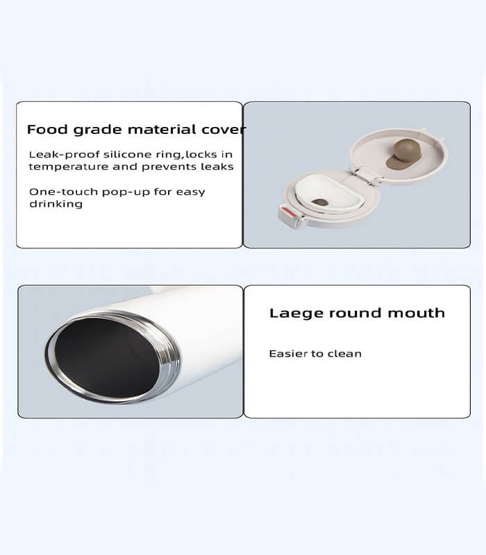 - طبقة العزل: عزل مزدوج الجدار متفرغ الهواء يحافظ على المشروبات ساخنة لمدة تصل إلى 8 ساعات وباردة لمدة تصل إلى 30 ساعة