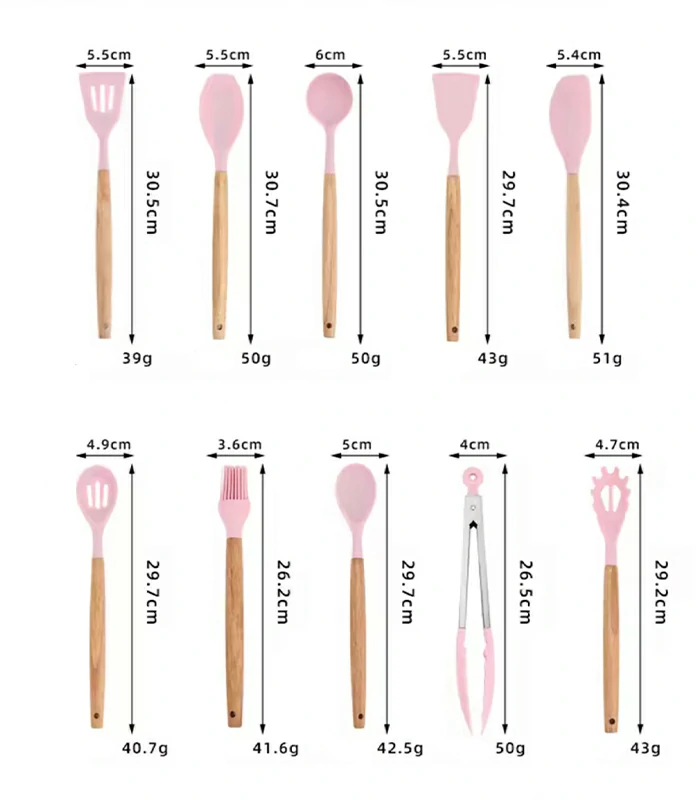 The silicon cooking utensils are heat-resistant and gentle on nonstick surfaces. They include everyday tools like a spatula, solid spoon, slotted spoon, pasta server, soup ladle, whisk, brush, and more. Each utensil is built for comfort and long-lasting use, making daily cooking tasks smoother and faster.