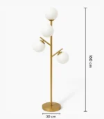 Standing tall at 160cm with a sleek 30cm base width, the 4 Arm Floor Lamp features a slim vertical rod in a gleaming gold metallic finish. From this central rod extend four arms, each positioned at a unique angle for visual balance and architectural appeal. At the end of each arm sits a frosted circular glass shade, housing a bulb that emits a soft, ambient glow. This thoughtful arrangement allows light to spread evenly throughout the space, making the Standing Lamp ideal for creating warm and inviting lighting in living rooms, bedrooms, or reading areas.