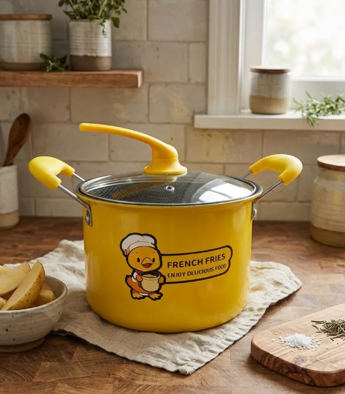 Bring both functionality and fun into your kitchen with this deep fryer, designed to make frying simple and enjoyable. With its playful duck chef design and bright yellow accents, this frying pot adds a unique touch to your cookware while helping you prepare crispy and delicious meals at home.