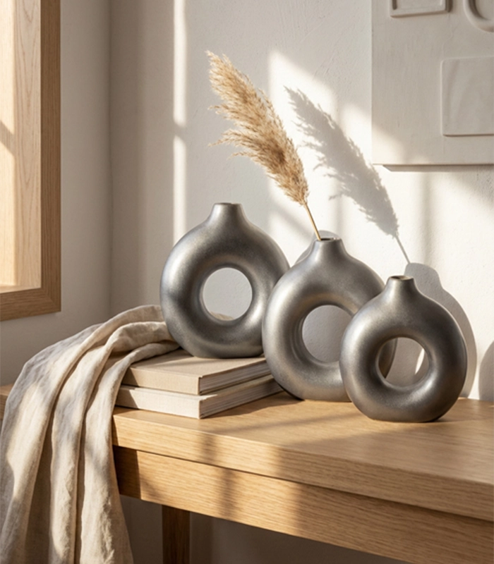 The standout feature of this donut vase ceramic is its sleek silver color, which creates a striking and elegant visual effect. This neutral yet stylish tone allows the donut vase to blend seamlessly with various color schemes while still standing out as a statement piece in your home.