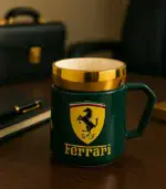 Its geometric handle offers a firm and modern grip, setting it apart from standard mugs. The contrast between the dark green ceramic and shiny gold lid gives it a luxurious feel that’s perfect for fans of high-performance cars and finely crafted drinkware.