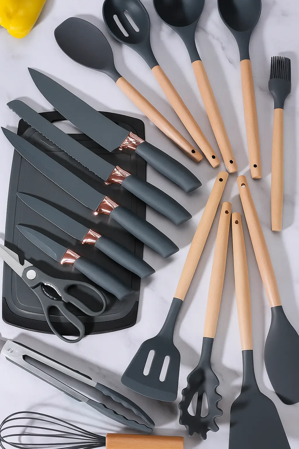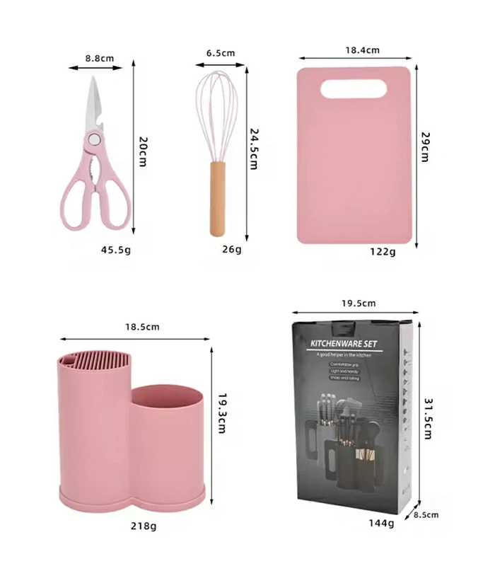 This 19-piece kitchen utensil set is the ultimate all-in-one solution for home chefs who value function, durability, and aesthetics. Featuring high-performance silicone cooking utensils and sharp stainless steel knives, this set is designed to handle everything from basic meal prep to gourmet cooking.