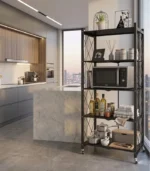 For added mobility and convenience, the unit is equipped with four smooth-rolling wheels that allow you to move the entire rack effortlessly from one place to another. The metal shelving unit is designed for both functionality and practicality. Its open shelf structure allows for proper air circulation and easy visibility of stored items, making organization simpler and more efficient.