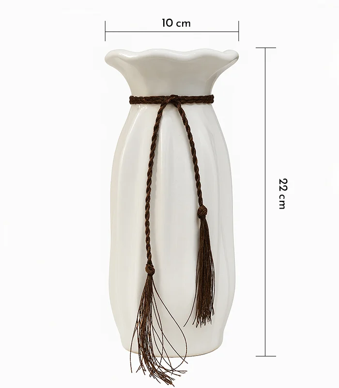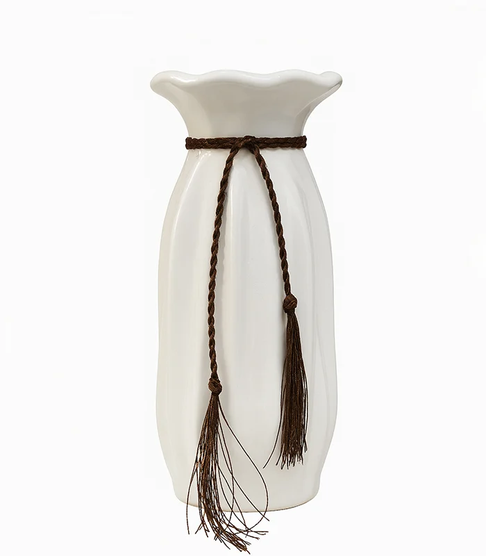 - Design: Decorative ceramic vase with braided rope detail