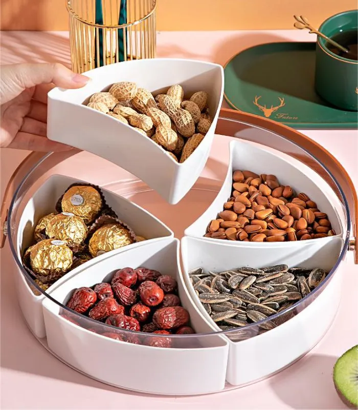 Thanks to its design, this snacks plate can be turned into storage container since its 5 plastic plates can be removed giving you the space to store your fruits or any food you want keeping it safe and fresh as you can secure it with its lid.