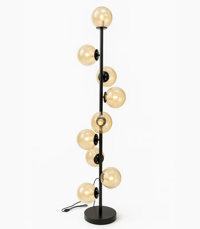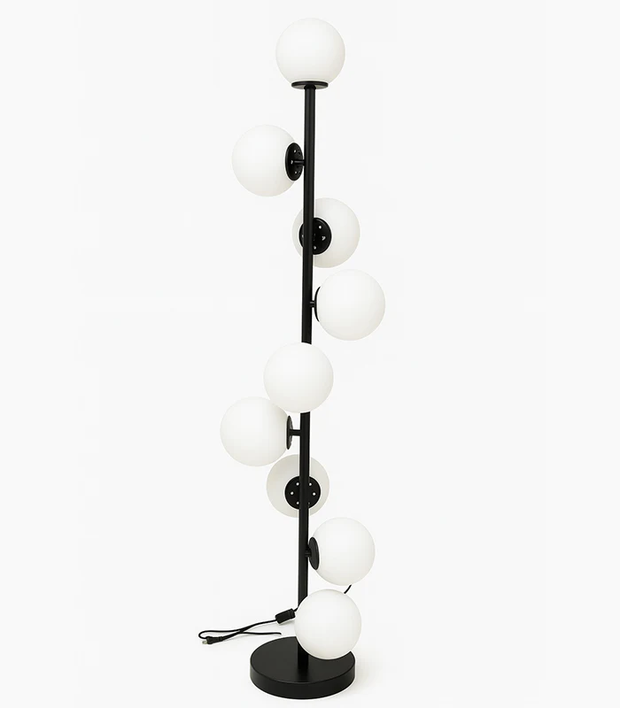Standing at 160cm tall with a 30cm width, the lamp features a central matte black metallic rod that serves as the spine for nine evenly spaced arms. Each arm supports a beautiful circular glass shade, creating a visually dynamic yet balanced arrangement. The result is a standing light lamp that adds vertical dimension and architectural interest to your space.